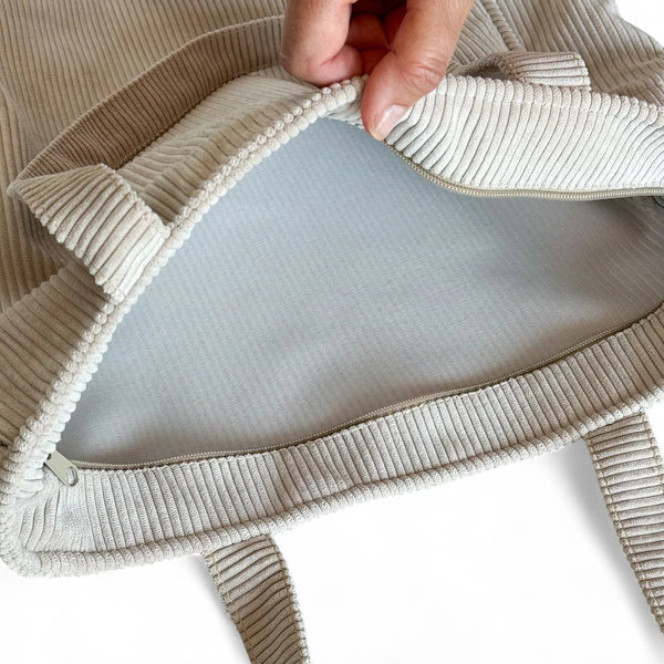 Dieser rechteckige Shopper von De La Mur Line ist aus beigefarbenem Cord-Rippstoff gefertigt.