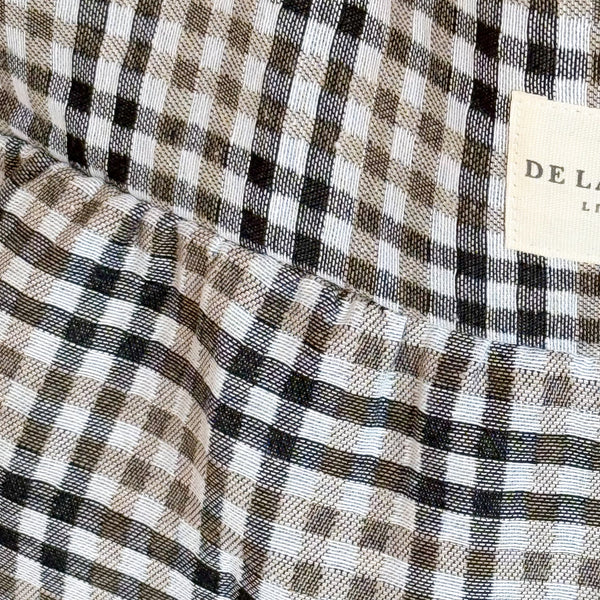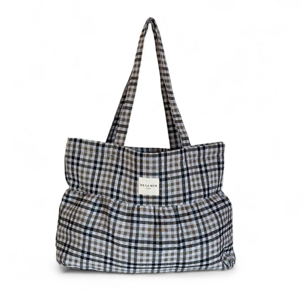 Dieser plissierte Shopper ist neu in der Kollektion und besteht aus einem dicken Jacquardstoff mit einem Karomuster in Beige- und Schwarztönen.