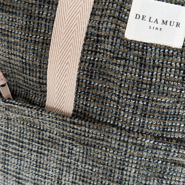 Ein Rucksack-Shopper ist eine stilvolle Mischung aus Rucksack und Einkaufstasche. Dank der kurzen Henkel kann man ihn bequem auf dem Rücken oder elegant in der Hand tragen. Dieser geräumige Rucksack besteht aus einem dicken Möbelstoff mit einer groben, gut sichtbaren Struktur in Khakitönen.
