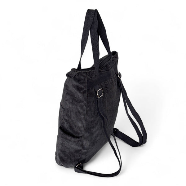 Ein Rucksack-Shopper ist eine stilvolle Mischung aus Rucksack und Einkaufstasche. Dank der kurzen Henkel kann man den Rucksack bequem auf dem Rücken oder elegant in der Hand tragen. Dieser geräumige Rucksack ist aus anthrazitfarbenem Cord-Rippstoff gefertigt.