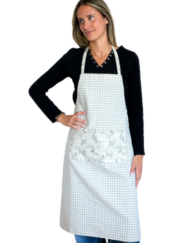 Diese Küchenschürze aus der La Mur Line ist aus einem Halbleinen-Panama-Gewebe mit einem pastellgrünen Vichy-Karomuster gefertigt, kombiniert mit einem Blumendruck auf einem gräulichen Hintergrund auf der Vorderseite.