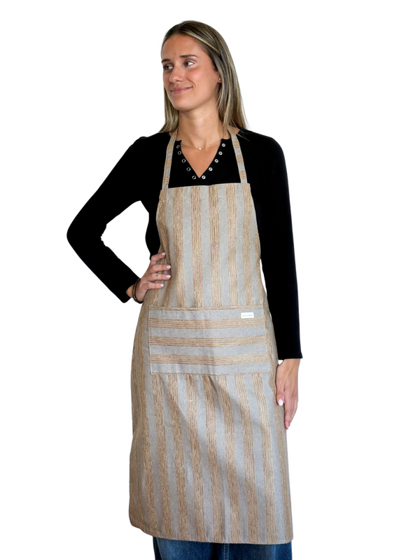 Diese Küchenschürze aus der La Mur Line ist aus einem Chenille-Stoff mit einer juteartigen Struktur und kupferfarbenen Streifen gefertigt.