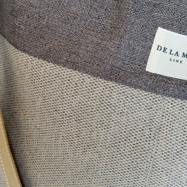 Diese große Schultertasche aus der La Mur Line ist oben aus einem dicken, taupefarbenen Möbelstoff und unten aus einem robusten, einfarbig beigen Möbelstoff gefertigt.