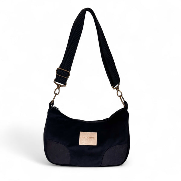 Diese kleine Schultertasche aus der La Mur Line in limitierter Auflage ist aus einem weichen, samtartigen schwarzen Stoff gefertigt, kombiniert mit eleganten Kunstlederakzenten in demselben tiefen Farbton an den Seiten.