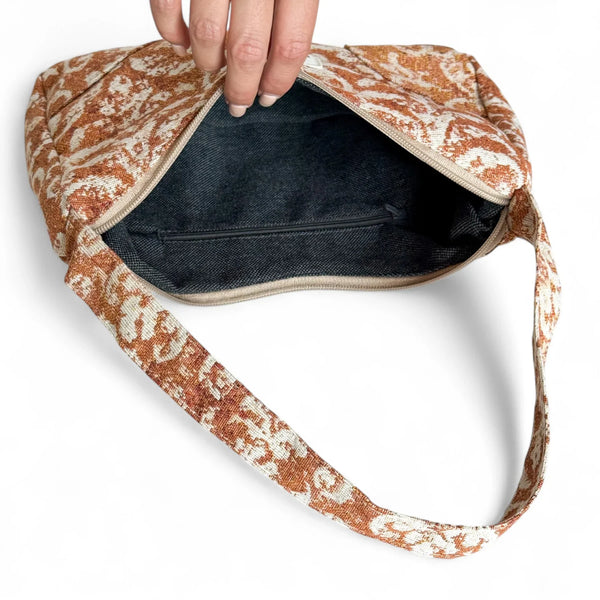 Diese kleine Umhängetasche von La Mur Line ist gefertigt aus einem dicken Jacquardstoff mit einem beigen Ornamentmuster auf rostbraunem Grund. Die Struktur und die Farbkontraste verleihen dem Stoff ein klassisches und barockes Aussehen.
