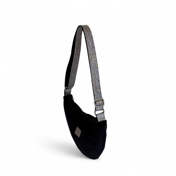 Der lange, verstellbare Schultergurt aus schwarzer Baumwolle hat auf einer Seite silberfarbenes Lurex (Glitzer) für einen festlichen Akzent. Sie können die Tasche quer über den Körper oder stilvoll über der Schulter tragen – ein schicker Abschluss für Ihr Outfit.