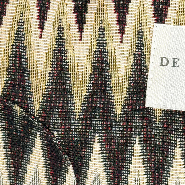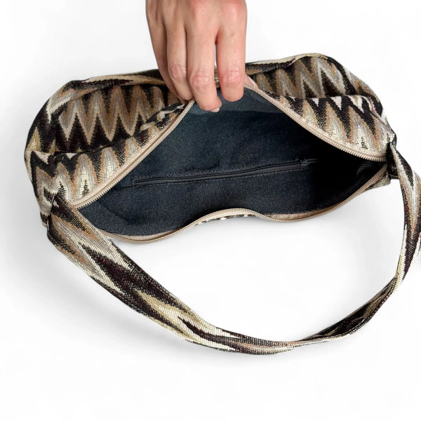 Diese kleine Umhängetasche von La Mur Line ist gefertigt aus einem dicken Jacquardstoff mit Zickzackmuster in Erdtönen wie Beige, Braun, Sand und Schwarz.
