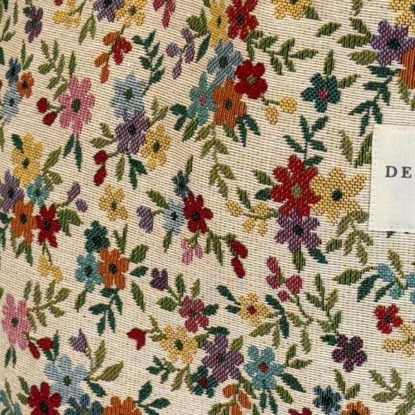 Dieser große Shopper der De La Mur Line besteht aus einem dicken Jacquardstoff mit einem mehrfarbigen Blumendruck auf beigem Hintergrund.