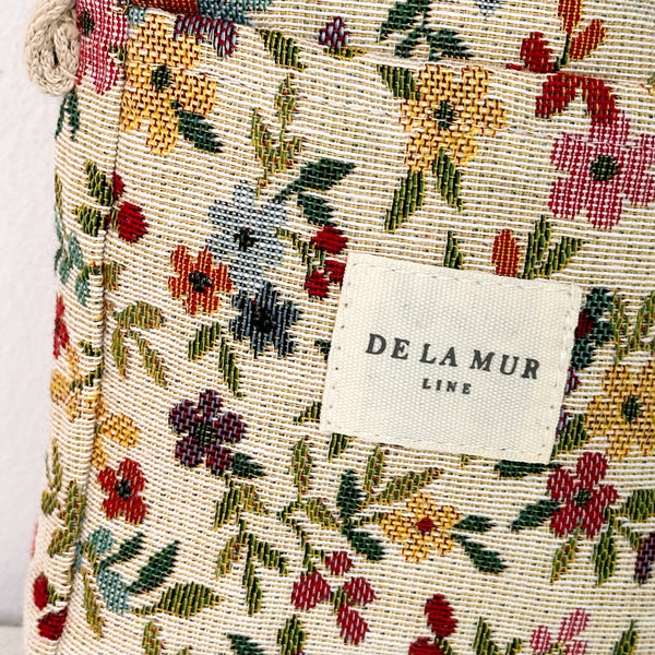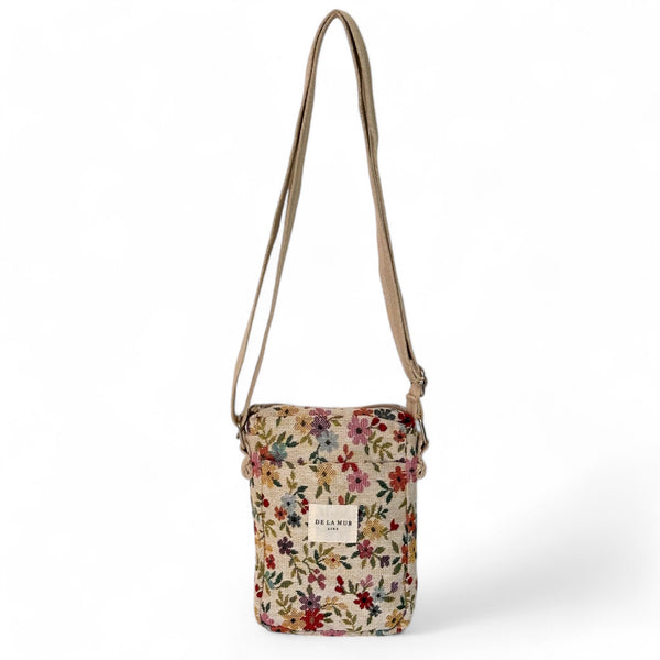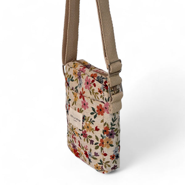 Dit leuke en compacte telefoontasje van de La Mur Line is uitgevoerd in een dikke jacquard stof met een meerkleurige, vrolijke bloeemnprint op een beige achtergrond.