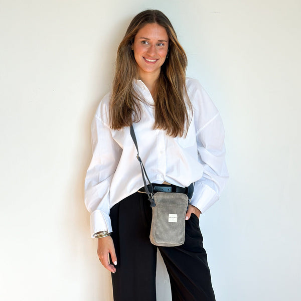 Diese süße und kompakte Handytasche ist aus grauem Cord-Rippstoff gefertigt.