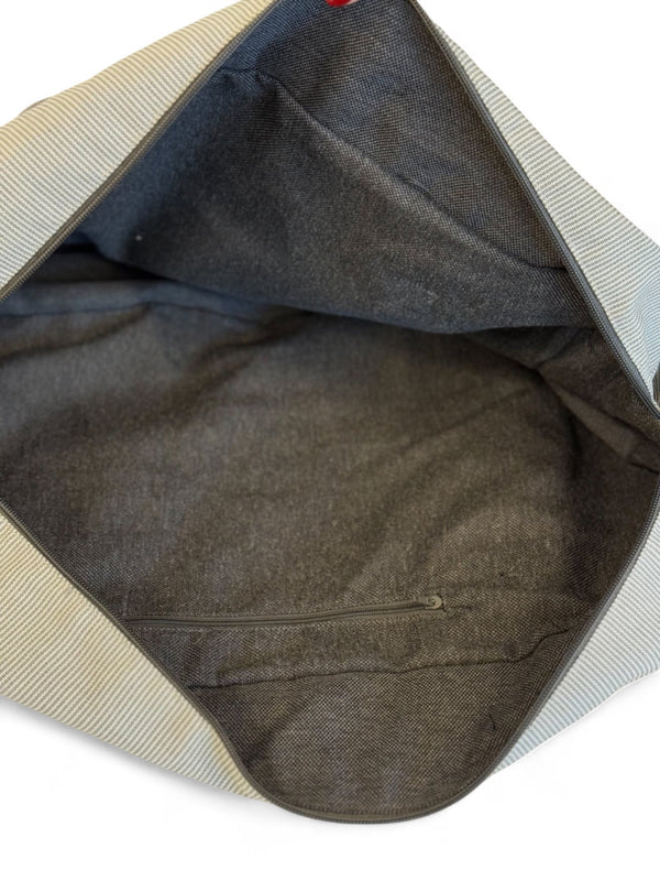- Grauer Reißverschluss auf der Oberseite der Tasche