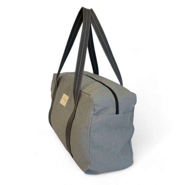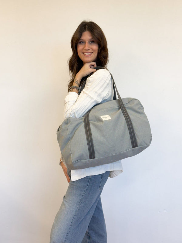 - Zwei stabile Tragegriffe/Gurte aus grauer Baumwolle