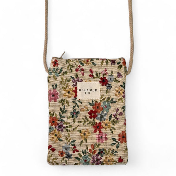 Diese süße Handytasche von La Mur Line besteht aus einem dicken Jacquardstoff mit einem mehrfarbigen Blumendruck auf beigem Hintergrund.