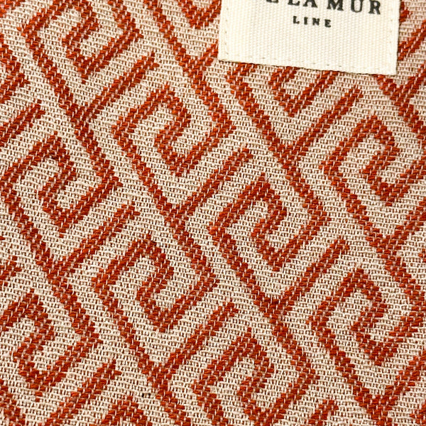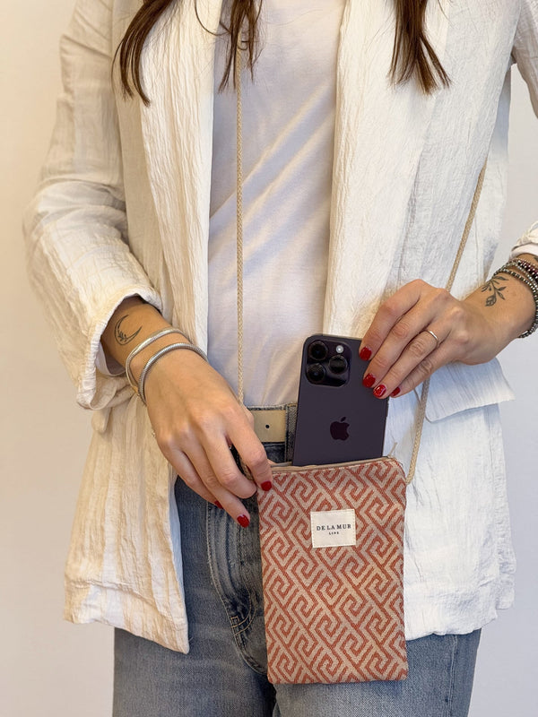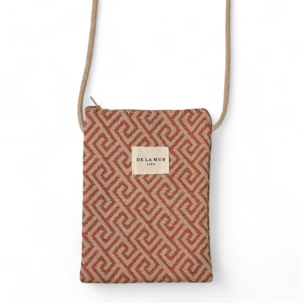 Diese süße Handytasche von La Mur Line besteht aus einem dicken Jacquardstoff mit einem geometrischen Druck in Kacheltönen.