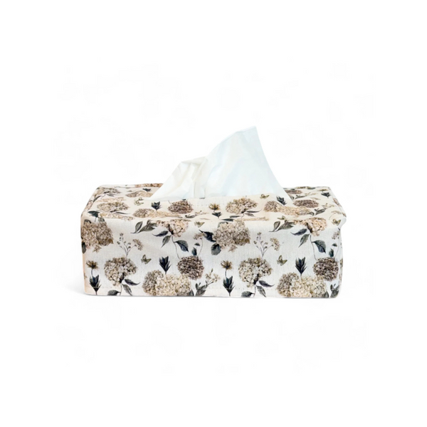 Diese Taschentuchboxhülle von De La Mur Line ist aus einem Halbleinenstoff mit einem beigen Blumendruck gefertigt.