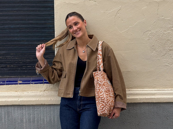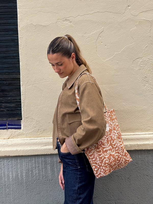 Dieser Shopper aus der La Mur Line ist aus einem dicken Jacquardstoff gefertigt, der ein beiges Ornamentmuster auf rostbraunem Grund zeigt. Die Struktur und die Farbkontraste verleihen dem Stoff ein klassisches und barockes Aussehen.