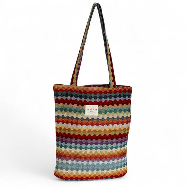 Dieser Shopper aus der La Mur Line ist aus einem dicken Jacquardstoff gefertigt, der ein rhythmisches, wellenförmiges Muster in farbenfrohen Streifen aufweist. Warme Töne wie Rost, Ocker, Türkis und Aubergine wechseln sich spielerisch ab.