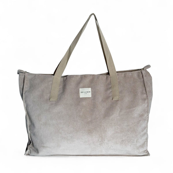 Diese Reisetasche ist aus beigefarbenem Cord-Rippstoff gefertigt.